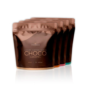 Prabangus, aromatingas kavos šveitiklių rinkinys. Sudarytas iš kokybiškos kavos mišinio su ruduoju cukrumi, himalajų druskos ir specialiai parinktų organinių, egzotinių aliejų derinio.